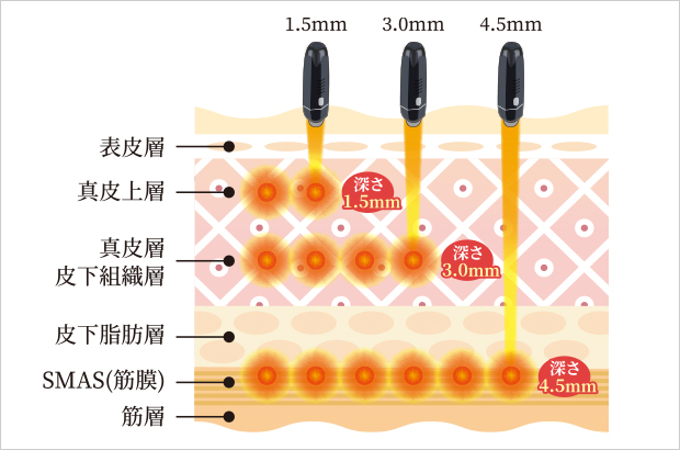 3種の照射深度の異なるカートリッジにより真皮、皮下組織、SMAS(筋膜)に熱凝固作用を与えることにより効果を発揮します。