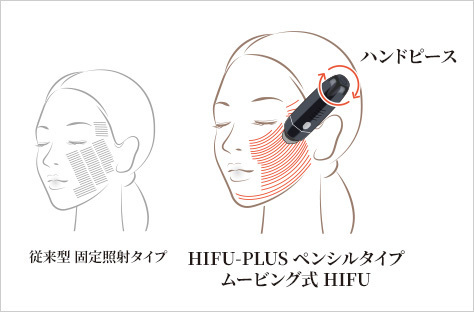 HIFU-PLUSは、高密度型焦点式超音波をハンドピースを回転させながら照射してお顔のリフトアップやタイトニングをする医療機器です。